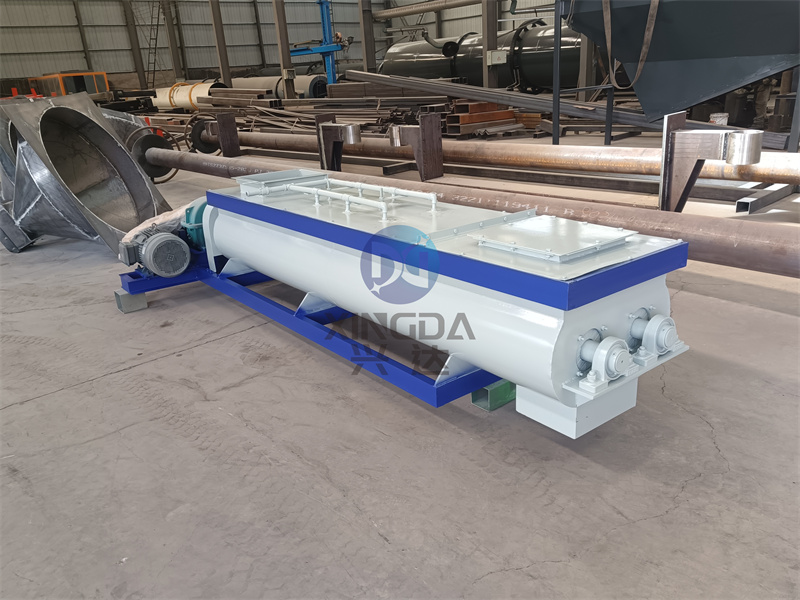 有機(jī)肥攪拌設(shè)備雙軸攪拌機(jī)攪拌區(qū)域內(nèi)裝有旋轉(zhuǎn)反向的漿葉,漿葉成一定角度將物料沿軸向、徑向循環(huán)翻攪,使物料迅速混合均勻。主要用于預(yù)加水成球工藝流程中,當(dāng)定量的生料粉由下料口流入攪拌糟中,經(jīng)若干個(gè)具有一定壓力的水霧化撒向生料粉,由定性長(zhǎng)度的軸經(jīng)攪拌葉攪勻后形成含水一致的球核,并輸送到預(yù)加水成球盤(pán)中去,整個(gè)攪拌分為霧化區(qū),拌勻區(qū)、卸料區(qū)三個(gè)區(qū)域。攪拌葉上焊硬質(zhì)金刀頭,耐磨性能好;適合于兩種以上肥料,添加劑預(yù)混料得混合,及配合飼料、濃縮飼料、添加劑預(yù)混飼料等的混合。雙軸攪拌機(jī)主要由機(jī)殼、螺旋軸總成、驅(qū)動(dòng)裝置、配管、蓋板、鏈罩等部件組成。