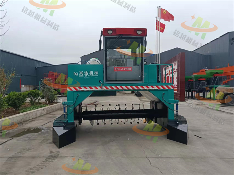 履帶式翻拋機采取履帶式行走設計,可前進、倒退、轉彎,由一人操控駕駛。行駛中整車騎跨予先堆置長條形肥機上,由機器下掛裝的旋轉刀?,對肥機原料實施翻拌、蓬松、移堆,車過之后形成新的條形堆垛,即可在開闊場地,也可在車間大棚實施作業。